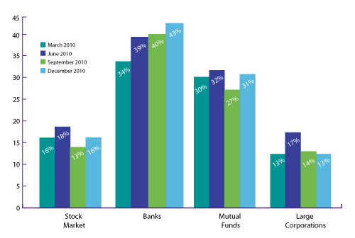 According to the latest data, trust in the stock market continues to show dramatic improvement; in fact, 21 percent of people surveyed want to increase their investments in the market versus 14 percent in September 2010. Similarly, only 11 percent of investors now believe a significant drop in the market is very likely, down from 16 percent just three months ago.