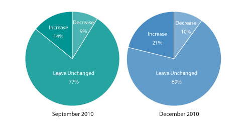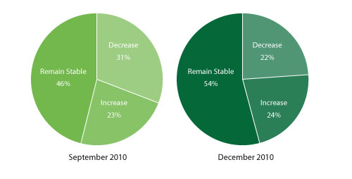 Homeowners are steadily gaining more confidence in the housing market and real estate prices compared to previous waves of data. For example, 54 percent of people surveyed this quarter forecast that prices will remain stable, a sharp increase over 46 percent in September 2010. Similarly, fewer respondents (22 percent) now believe that home values will decrease during the next 12 months (as compared to 31 percent three months ago).